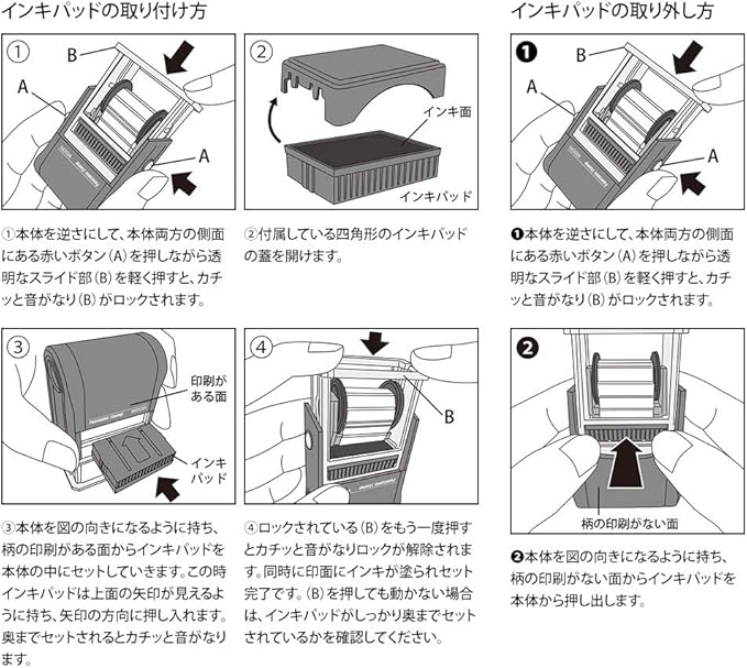 ※長期間スタンプを使用しない場合はインキパッドを本体から取り外し、インキパッドに蓋をして保管してください。