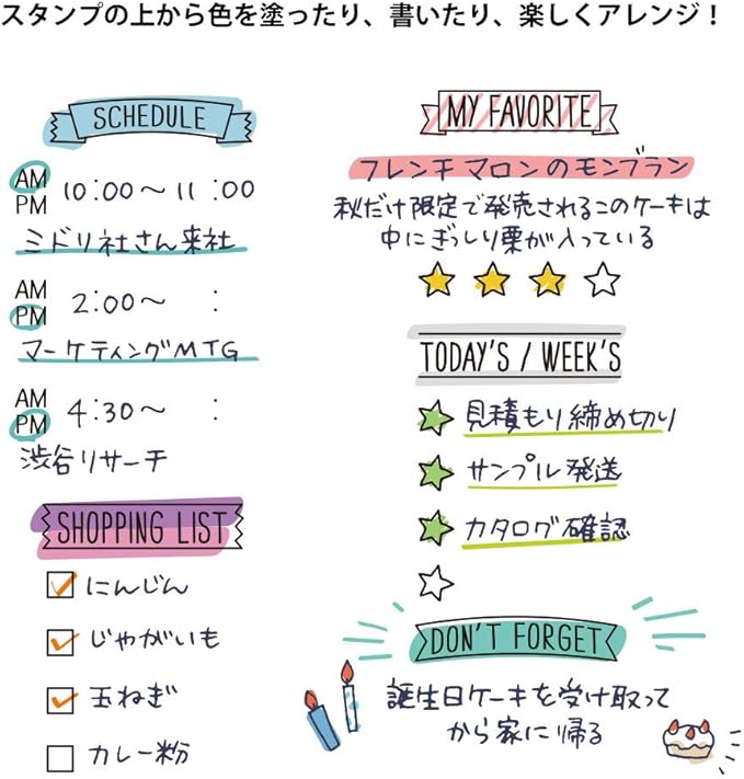 ノートやダイアリーなどを簡単にデコレーションできる楽しいスタンプ。
