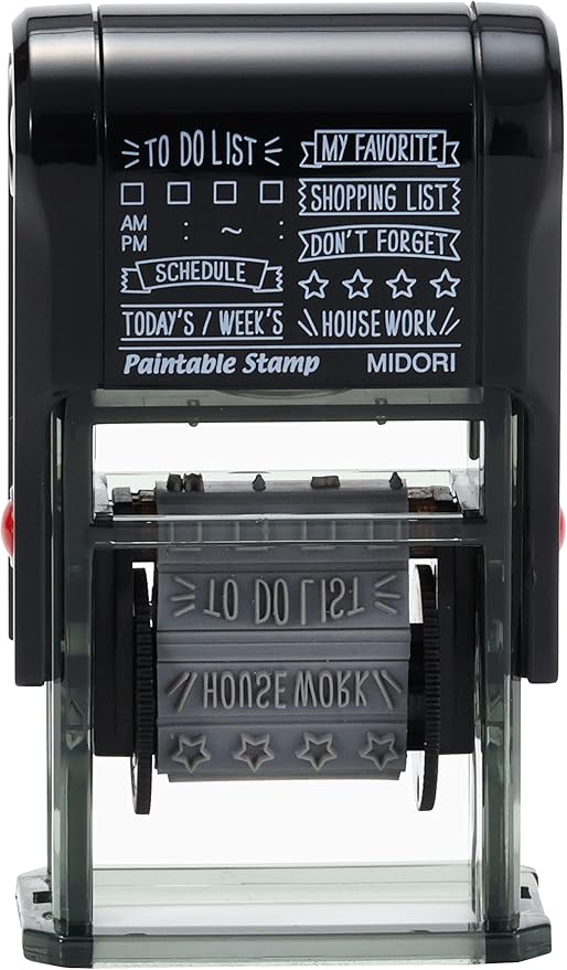 回転して柄を選べ、ノートやダイアリーなどを簡単にデコレーションできる楽しいスタンプです。