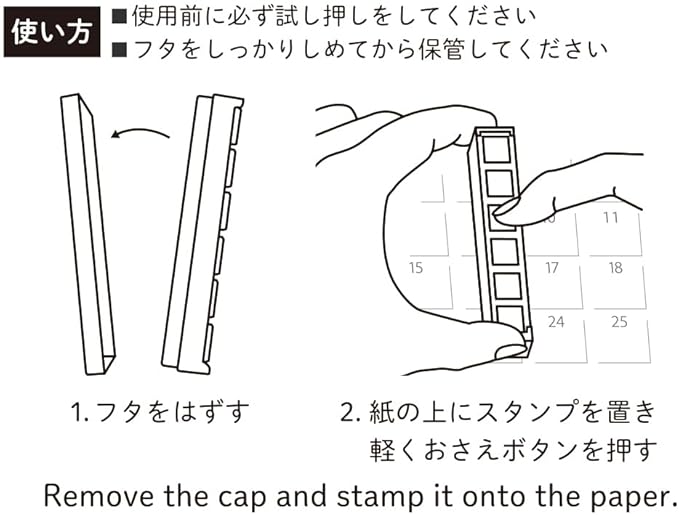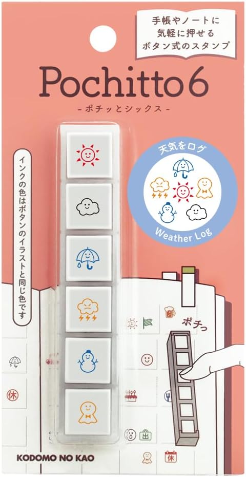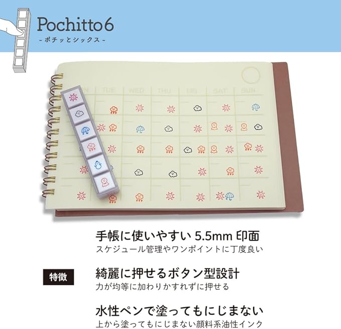 チっと軽く押すだけで綺麗にスタンプが押せる「ポチっとシックス」は、キーボードのようなボタン式浸透印で手元が安定して押しやすく、従来のスタンプの押し損じを解消します。また油性インクを採用しているので、上から水性ペンで塗ってもにじみません。約1,000回捺印可能・使い切りタイプです。