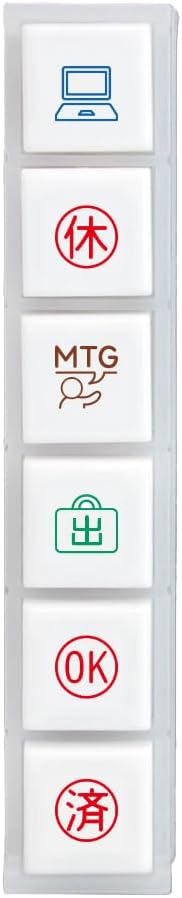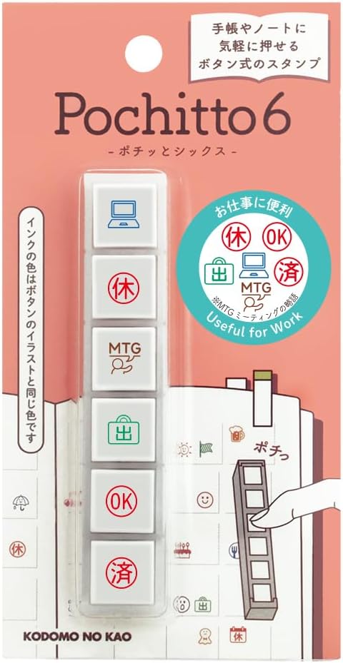 チっと軽く押すだけで綺麗にスタンプが押せる「ポチっとシックス」は、キーボードのようなボタン式浸透印で手元が安定して押しやすく、従来のスタンプの押し損じを解消します。また油性インクを採用しているので、上から水性ペンで塗ってもにじみません。約1,000回捺印可能・使い切りタイプです。