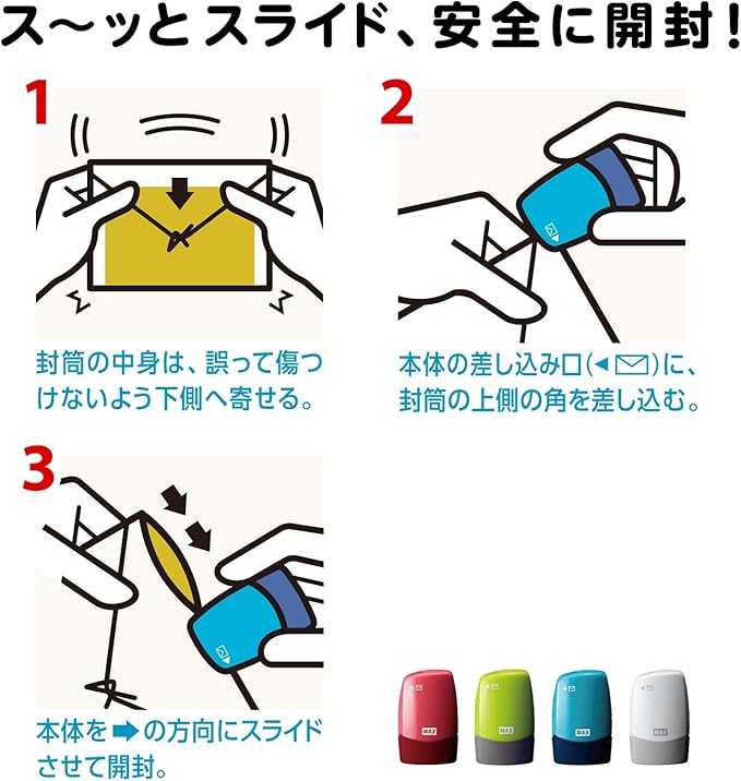 ス~ッとスライド、安全に開封できるレターオープナー+転がしながら隠したいポイントを一気に塗りつぶせるローラースタンプ。1台2役の便利グッズです。