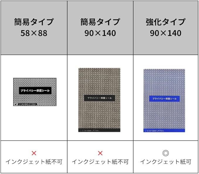 ✅個人情報保護シール ✅3種類よりお選びください。 ✅簡易(90 140)⇒ハガキ全体を覆い張り直し可能なシール※インクジェット用紙不可 ✅簡易(58 88)⇒ハガキの一部を覆い張り直し可能なシール※インクジェット用紙不可 ✅強化(90 140)⇒ハガキ全体を覆うシールで剥がすと再度貼ることができません。 ※インクジェット用紙可 ✅安価で注文後即日納品