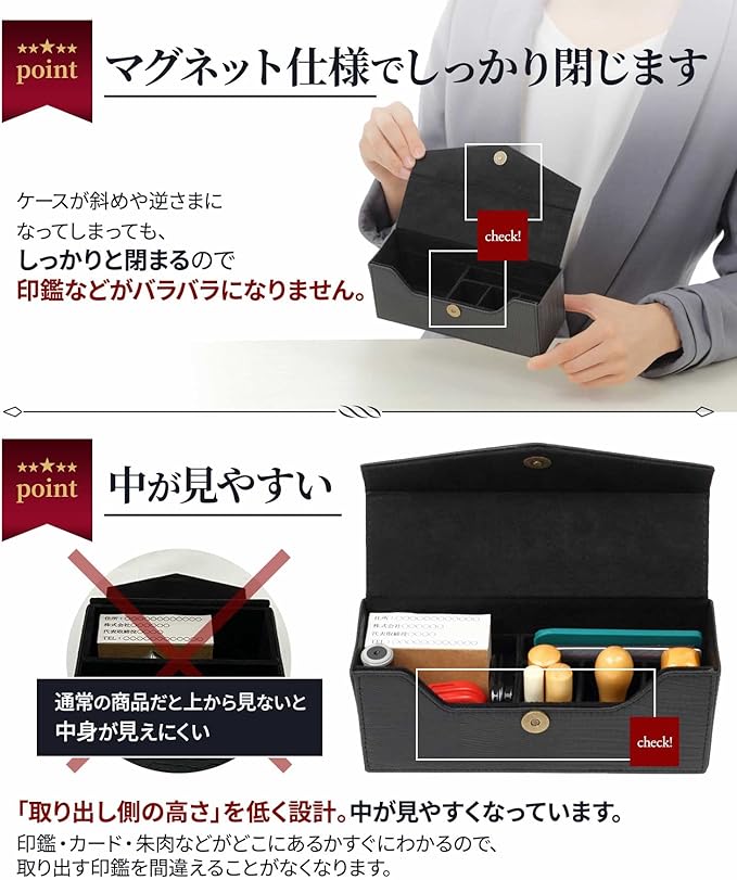 中身が見やすく印鑑が取り出しやすい形になっており、すぐに印鑑を取り出すことができます。 銀行・契約・商談などの外出先にも持ち運び出来る大きさなので、とても利便性の高い印鑑ケースとなっております。 印鑑だけでなく印鑑マット、朱肉、法人カード、印鑑カード、名刺などをまとめて収納可能でコンパクトに持ち運びいただけます。