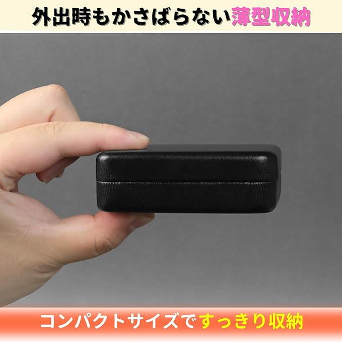 【外出時もかさばらない薄型収納】「法人印鑑3本をまとめて歩きたいけど、かさばるのは嫌…」当店の法人印鑑ケースは横9cm、縦7.5cm、高さ3cm、重量約100gと名刺入れを少し大きくした程度のサイズ感。実印・銀行印・角印の印鑑3本がすっきりまとめて入ります。上品な見た目で商談・契約シーンも安心。おしゃれでコンパクトな薄型設計のため、持ち運びも非常に便利です。