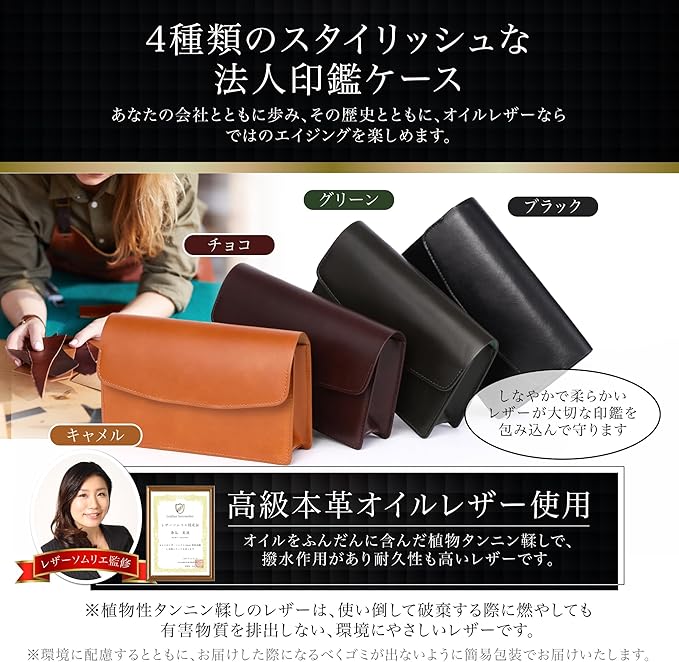 【シンプルな外観、本革の高級感】法人印鑑ケースは契約や商談などビジネスの重要な場で使われるものだからこそ、上質な牛革(オイルレザー)をふんだんに使用して作り上げました。熟練の革職人が細部までこだわりを持って、一つひとつ手で作り上げた逸品です。「会社の大切な印鑑をきちんと守りたい」「長く使うものだからこそ高級かつ良質な素材で」そんな思いが詰まった印鑑ケースです。耐久性の高いオイルレザーを使いやすい薄さまで丁寧に鞣しているので、手触りが非常に柔らかく、収納アイテムが取り出しやすくなっています。オイルレザーは使い込むほどに柔らかく、艶が増して自分だけのエイジングをお楽しみいただける多彩な表情が魅力のレザーです。