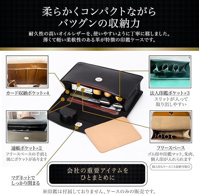 【収納力について】法人用印鑑3本とゴム印、通帳、印鑑カードや銀行カード、個人印(実印・認印)や朱肉などをまとめて収納でき、契約時に必要な印鑑類やその他アイテムをまとめて持ち運びできます。また、コンパクトなサイズでカバンに入れやすいのもポイント。ビジネスバッグにもスッキリ入れられます。ボタンはマグネットタイプで、開け閉めも簡単です。収納力が高いので、会社の重要アイテムをそのままオフィスで保管するのにも便利です。