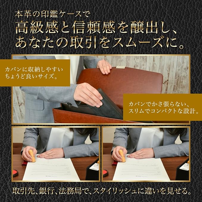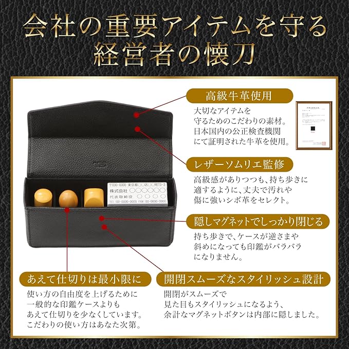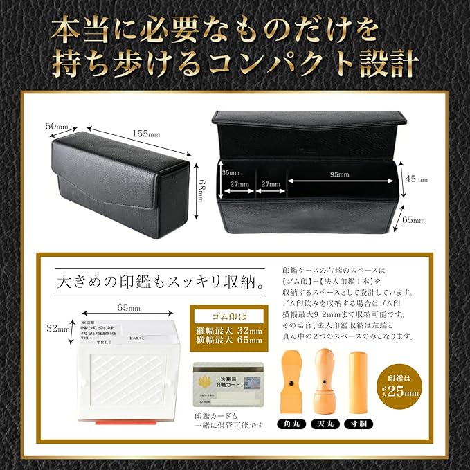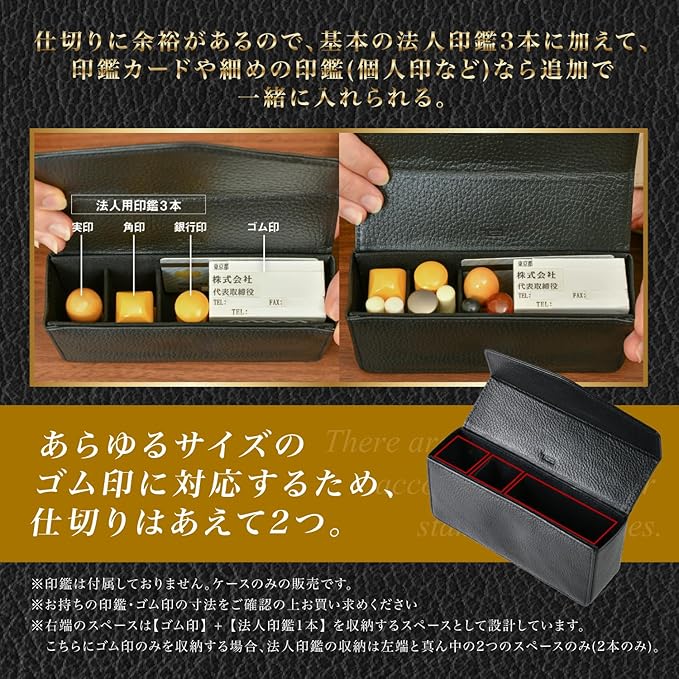 【収納力について】法人用印鑑3本とゴム印をまとめて収納できます。さらに、仕切りに余裕を持たせているので、個人印鑑や認印、印鑑カードや銀行カードなども一緒に入れることができ、契約時に必要な印鑑類をまとめて持ち運びできます。また、コンパクトなサイズでカバンに入れやすいのもポイント。薄型のビジネスバッグにもスッキリ入れられます。ボタンはマグネットタイプで、開け閉めも簡単です。