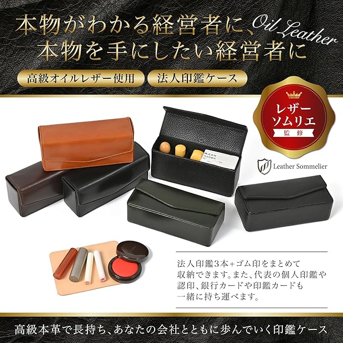 印鑑ケース 法人 牛革 本革 オイルレザー 【レザーソムリエ監修】 印鑑3本 (代表印 銀行印 角印) ゴム印 (住所印 社判 会社印)(チョコ)