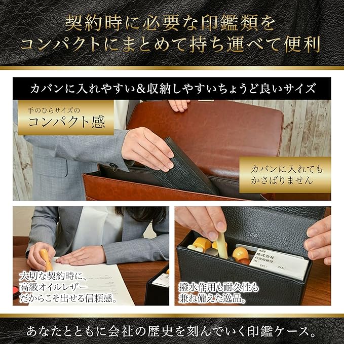 【収納力について】法人印鑑3本とゴム印をまとめて収納できます。さらに、仕切りに余裕を持たせているので、個人印鑑や認印、印鑑カードや銀行カードなども一緒に入れることができ、契約時に必要な印鑑類をまとめて持ち運びできます。また、コンパクトなサイズでカバンに入れやすいのもポイント。訪問先にもある朱肉や印鑑マットなどはあえて持ち歩かない必要最低限の収納で、薄型のビジネスバッグにもスッキリ入れられます。ボタンはマグネットタイプで、開け閉めも簡単です。