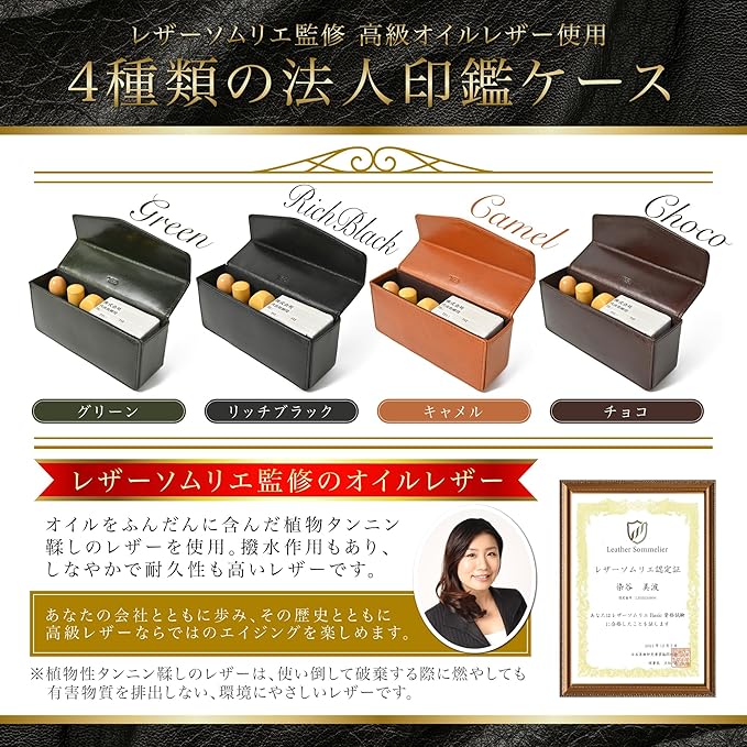 【シンプルな外観、本革の高級感】法人印鑑ケースは契約や商談などビジネスの重要な場で使われるものだからこそ、上質な牛革(オイルレザー)をふんだんに使用して作り上げました。熟練の革職人が細部までこだわりを持って、一つひとつ手作りで仕上げた逸品です。「会社の大切な印鑑をきちんと守りたい」「長く使うものだからこそ高級な素材で」「会社の歴史と共に歩んでいく」そんな思いが詰まった印鑑ケースです。