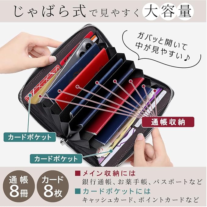 [KASSAI]牛革 通帳ケース じゃばら式大容量 RFID スキミング防止 パスポート カードケース(ブラック)