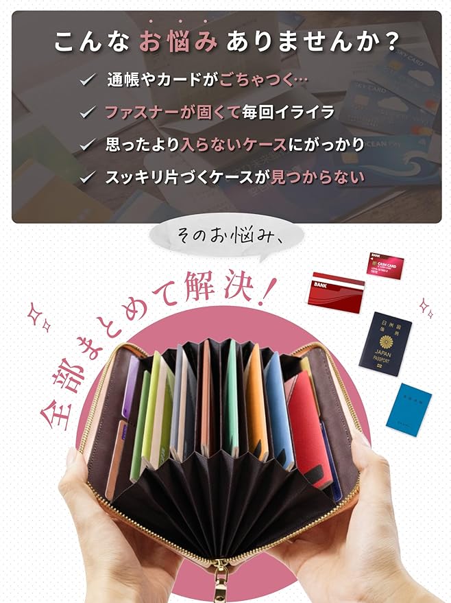 ✅【通帳16冊・カード8枚が入る驚異の収納力】 増えがちな通帳やカードもたっぷりはいる大容量設計 。180度開閉式で、通帳最大16冊に加え、印鑑、お薬手帳、パスポートまで一括管理 。どこに何があるか一目瞭然になり、通帳管理の効率が劇的に向上します。