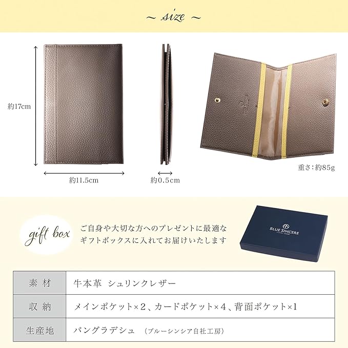 【ブルーシンシアとは?】 「限定商品の発展とともに、バングラデシュの社会問題を解決する」という理念を掲げ、 バッグや財布を自社工場のバングラデシュの職人たちと、その土地の素材の可能性を追求し、 先進国でも通用する高機能なプロダクトを生産しています。 【通帳やカードを、これひとつでスッキリ管理!】銀行口座はいくつ持っていますか?通帳レスが進む中、ハッキングの不安もあり、手元に残しておきたい方も多いはず。でも、通帳やカードが増えると管理が面倒…。そこで誕生したのが、BLUESINCEREのスリム通帳ケース。主婦の皆さんの声をもとに、理想の機能を取り入れつつスリムなデザインを実現しました。通帳4冊とカードが最大8枚を収納可能で、口座管理もラクラク。毎日をもっと快適にする、頼れる一冊。家族の通帳やカードをまるごと入れて、これひとつでスッキリ収納しませんか?
