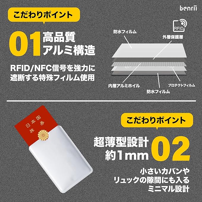 【RFIDスキミング防止】RFID信号を遮断し、パスポートやカード情報を安全に保護します。