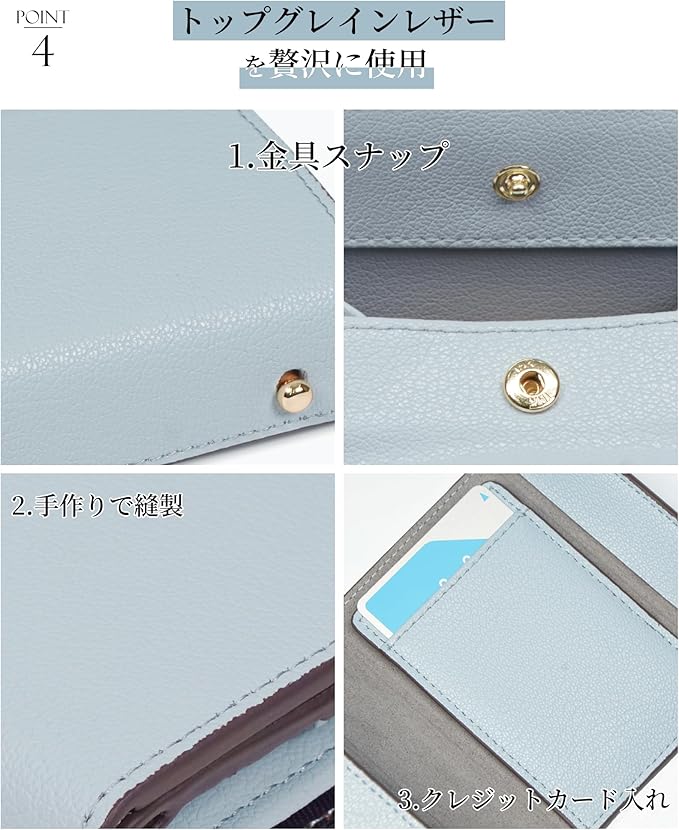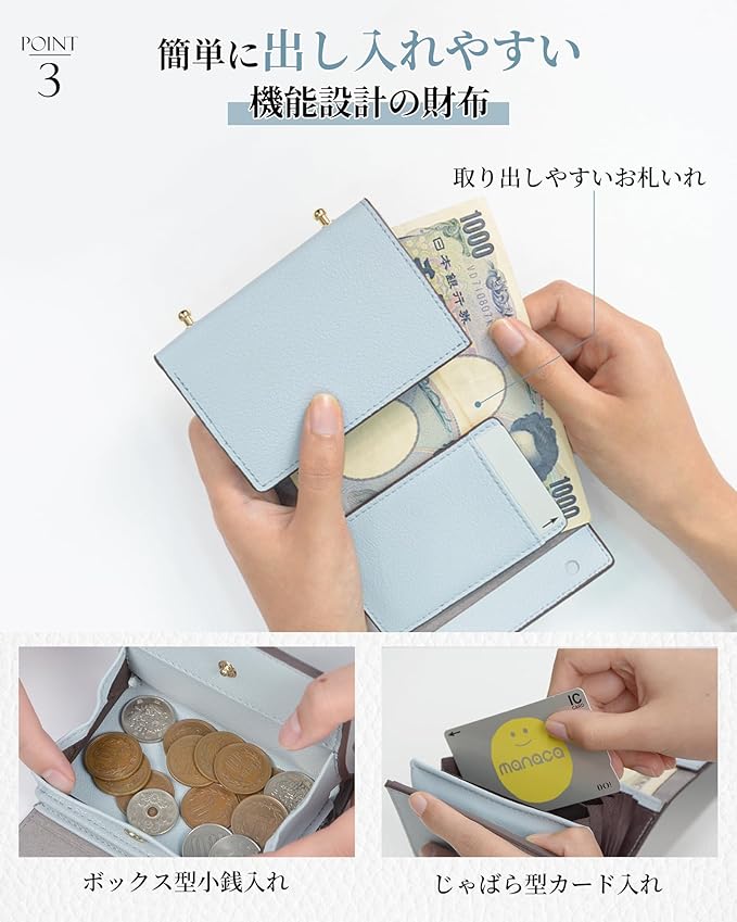 「使いやすいミニ財布」使いやすさを徹底的に考えた設計で、開閉が簡単にできるよう工夫されています。スナップボタンは操作がスムーズで、急いでいるときでもストレスを感じません。じゃばら型カードポケットとボックス小銭入れは使いやすさの鍵、必要なアイテムがすぐに見つかるよう整理されています。日常の忙しいシーンでも、手軽に使えるのが魅力です。