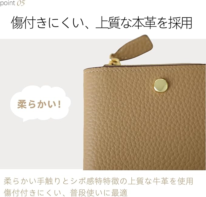 【マチ付き小銭入れ】取り出しやすいL字型ファスナーを採用し、マチ付きで大きく開きます。小銭の取り出しがスムーズで、使い勝手抜群。内布は明るいベージュで視認性も良好、使うたびに便利さを実感できま