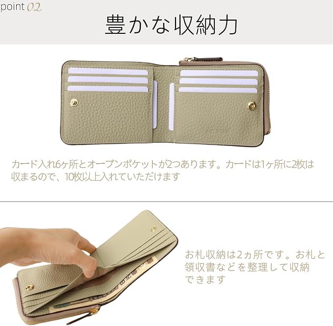 【長財布並みの収納力】カード収納は6か所、オープンポケットが2つ。カードは1か所に2枚重ねて収納可能で、10枚以上入れることができます。オープンポケットにもカードや免許証、保険証などを安心して収納できるので、便利でセキュリティも完備。お札は最大10枚、小銭は約30枚まで収納可能。十分な収納力を備えつつ、デザインはスマートで上質なミニ財布です。