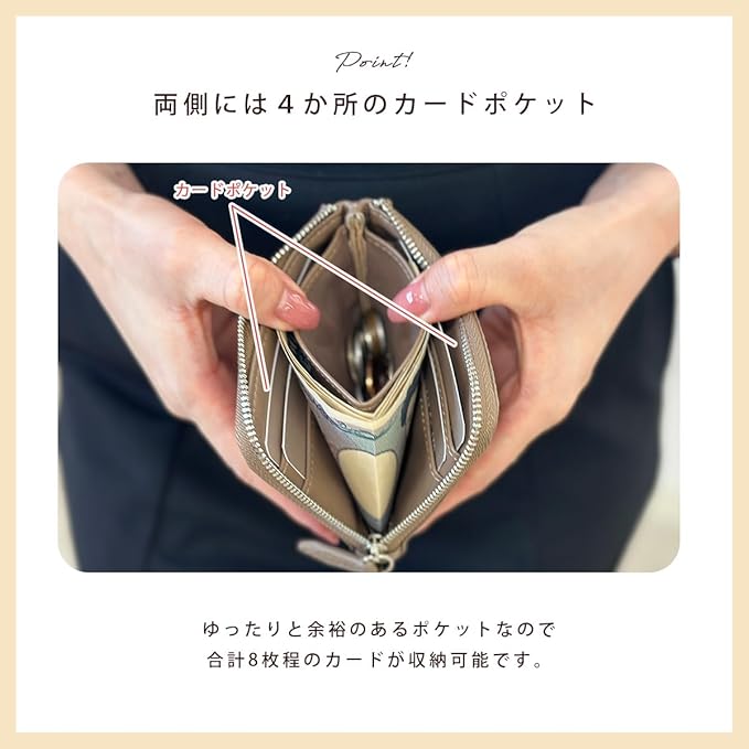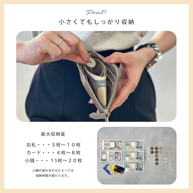 【小さくてもしっかり収納】・お札は10枚程度、カードは8枚まで、小銭は15~20枚収納可能。カードポケットはゆとりがあり、取り出しやすい。