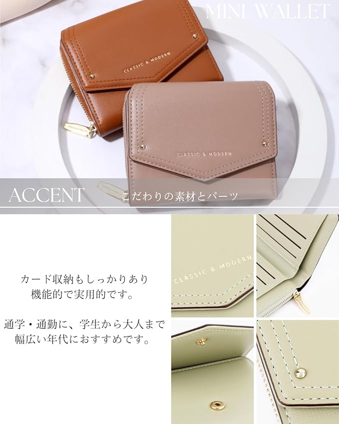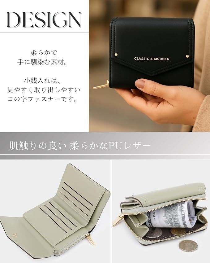 【デザインと機能】小銭入れは、見やすく取り出しやすいコの字ファスナーです。カード収納もしっかりあり、コンパクトながら十分な収納力。通学・通勤に、学生から大人まで幅広い年代におすすめです。