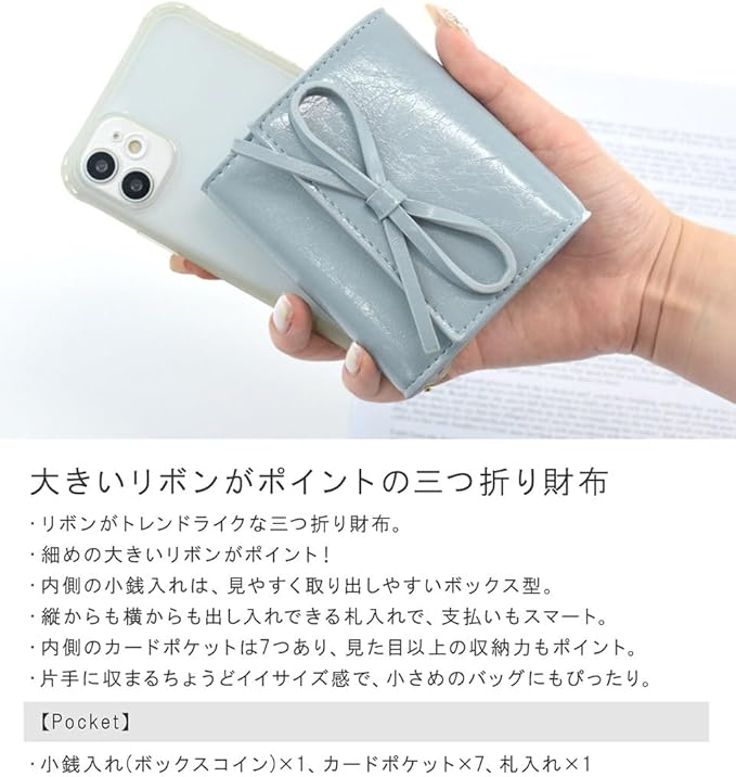 ・リボンがトレンドライクな三つ折り財布。・細めの大きいリボンがポイント!・内側の小銭入れは、見やすく取り出しやすいボックス型。・縦からも横からも出し入れできる札入れで、支払いもスマート。・内側のカードポケットは7つあり、見た目以上の収納力もポイント。・片手に収まるちょうどイイサイズ感で、小さめのバッグにもぴったり。【ご注意】 ・お客様のモニター環境や、お部屋の照明・日当たり具合などにより、実際のお色味と異なる場合がございます。 ・サイズ・重さは、平置き・メジャー採寸のため、商品ごとに多少の誤差が生じる場合がございます。 ・プリント・型押し加工などの柄物は、裁断位置により一点一点表情の違う仕上がりになります。 ・生産時期により、色・サイズ・デザインが多少異なる場合がございます。 ・製造工程の関係上サイズ感には若干の個体差がございます。アパレル、ストールなどの布製品【約-2cm~+2cm】ニット製品【約-3cm~+3cm】 ※無断での画像の転載などは、禁止しております。