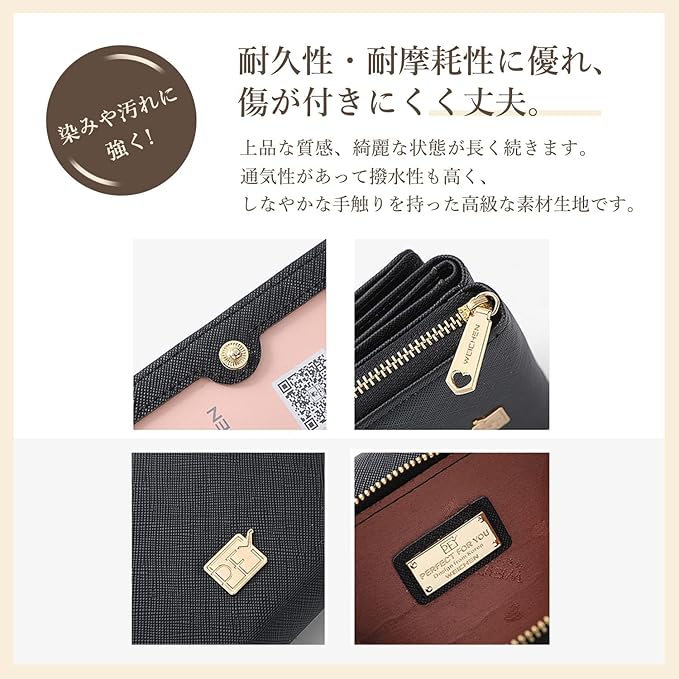 【高品質PUレザー】撥水性がある素材は耐久性も高く、長くご愛用いただけます。少しの汚れならサッと拭いてキレイになるお手入れが簡単なお財布です。