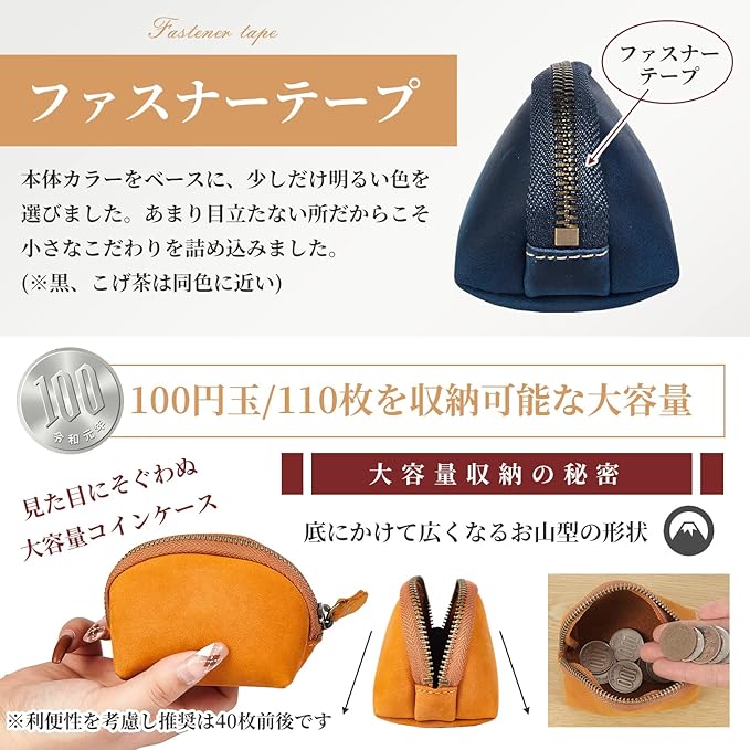 【100円玉 110枚を収納可能な大容量】 手のひらにのるほどコンパクトですが100円玉を110枚収納可能な大容量を誇ります。その秘密は底にかけて広くなるお山型の形状。見た目にそぐわぬ大容量コインケースです。利便性を考慮し推奨は40枚前後です。