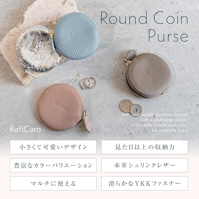 [RafiCaro] コインケース 丸型 小銭入れ 本革 YKKファスナー ミニ財布 ミニポーチ 小物入れ 化粧ポーチ マルチケース ラウンド型 シンプル おしゃれ 軽量 ダスティブルー