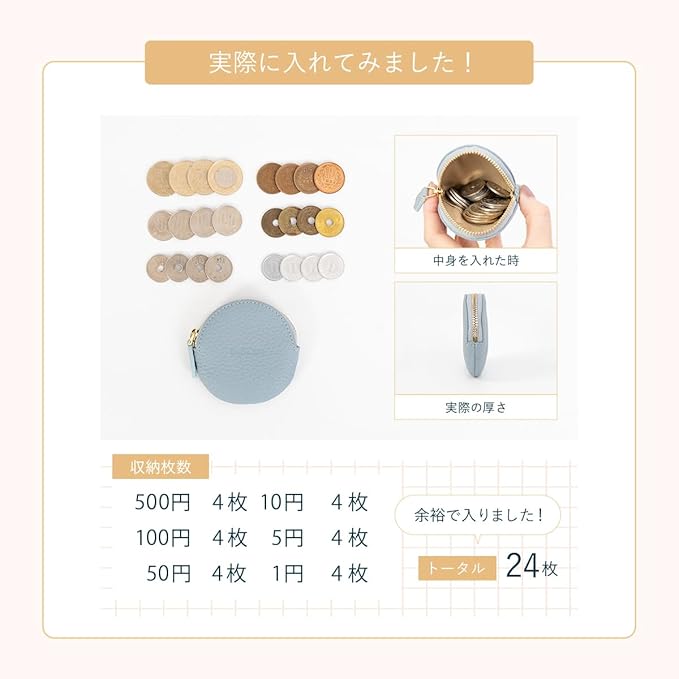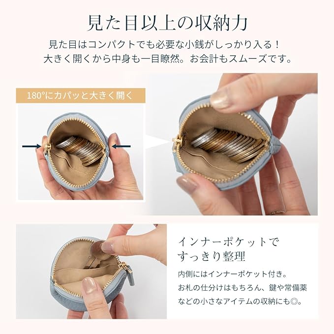 【手のひらサイズのレザーケース】 まるいフォルムがかわいい小銭入れです。小さめバッグにもポケットにも収まり、気軽に持ち歩けるサイズ感。見た目以上の収納力。コイン以外にもアクセサリーやイヤフォンのケースとしてもお勧めです。