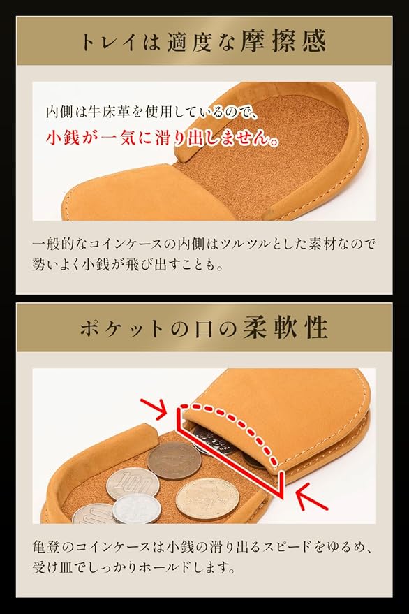 【計算されたトレイ構造で小銭が飛び出さない】 内側には、あえて適度な摩擦感を持つ牛革を採用しています。従来のツルツルした素材と異なり、コインが勢いよく一気に滑り出るストレスを解消。 しっかりと受け皿でホールドし、スムーズな出し入れをサポートします。