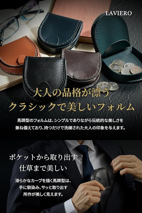 【大人の品格が漂うクラシックで美しいフォルム】高級レザーで製作したメンズ馬蹄型小銭入れ。馬蹄型のフォルムはシンプルでありながら伝統的な美しさを兼ね備えており、持つだけで洗練された大人の印象を与えます。滑らかなカーブは手に馴染み、ポケットから取り出す所作が美しく見えます。馬蹄型は古来より「幸運を呼び込む形」とされ、富や幸運のモチーフとして人気があります。金運を上げたい方にもおすすめの縁起の良いアイテムです。