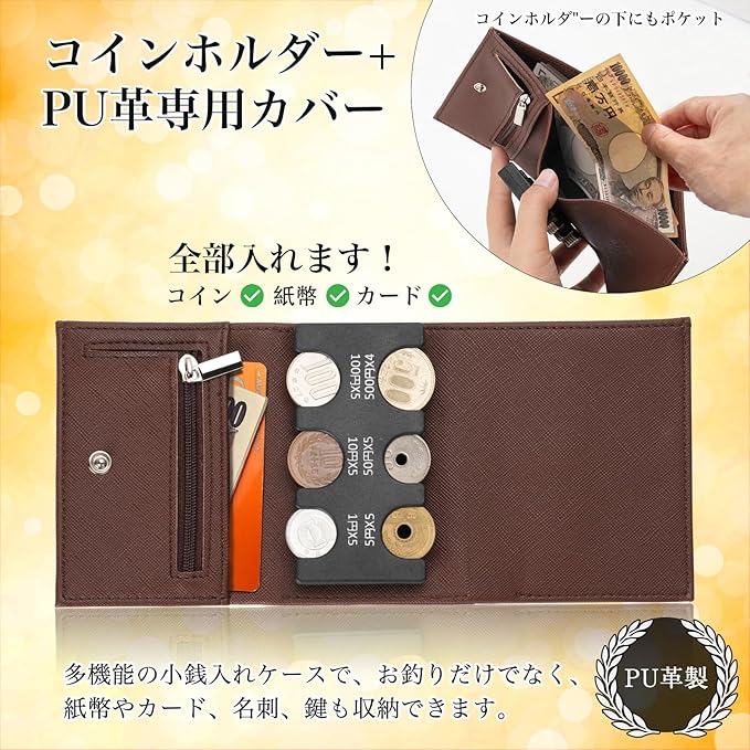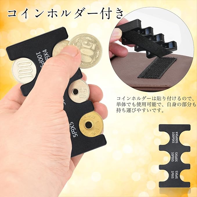 【多機能の小銭入れケース】コインホルダーは単体でも使用可能で、自身の部分も持ち運びやすいです。小銭入れはお釣りだけでなく、紙幣やカード、名刺、鍵も収納できます