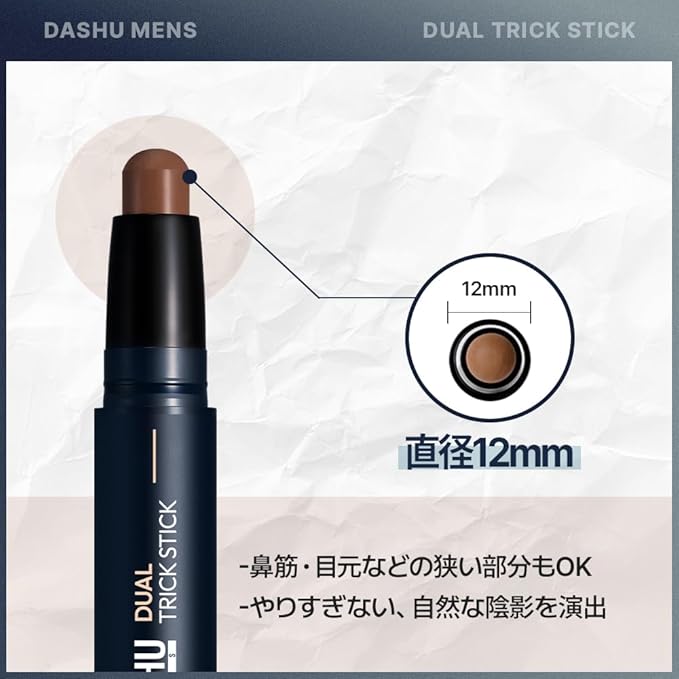 【シェーディング+コンシーラー 2in1】1シェーディング+コンシーラーが1本でOK、陰影も肌悩みカバーも簡単 ・直径12mmの細身スティック: 過度にならず、鼻筋・目元など細かい部分にも使いやすい ・ツール不要、簡単使用 : 軽く塗ってなじませるだけで、自然な陰影が完成