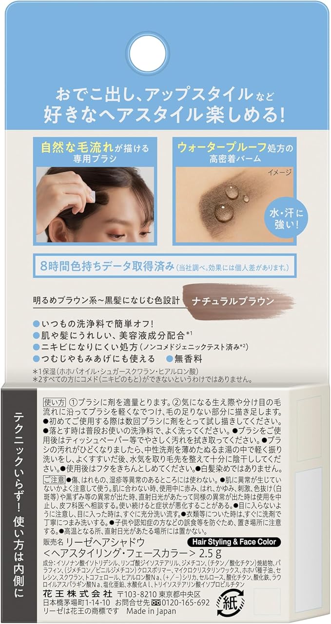 夕方までバレずにかわいく!おでこ隠しバーム おでこ出し、アップスタイルなど好きなヘアスタイル楽しめる! ◆自然な毛流れが描ける専用ブラシ ◆ウォータープルーフ処方の高密着バームだから、汗・水に強い ◆8時間色持ちデータ取得済み(当社調べ。効果には個人差があります。) ・明るめブラウン系~黒髪になじむ色設計(ナチュラルブラウン) ・いつもの洗浄料で簡単オフ! ・肌や髪にうれしい、美容液成分配合*1 ・ニキビになりにくい処方(ノンコメドジェニックテスト済み*2) ・つむじやもみあげにも使える ・無香料 *1 保湿(ホホバオイル・シュガースクワラン・ヒアルロン酸) *2 すべての方にコメド(ニキビのもと)ができないというわけではありません。