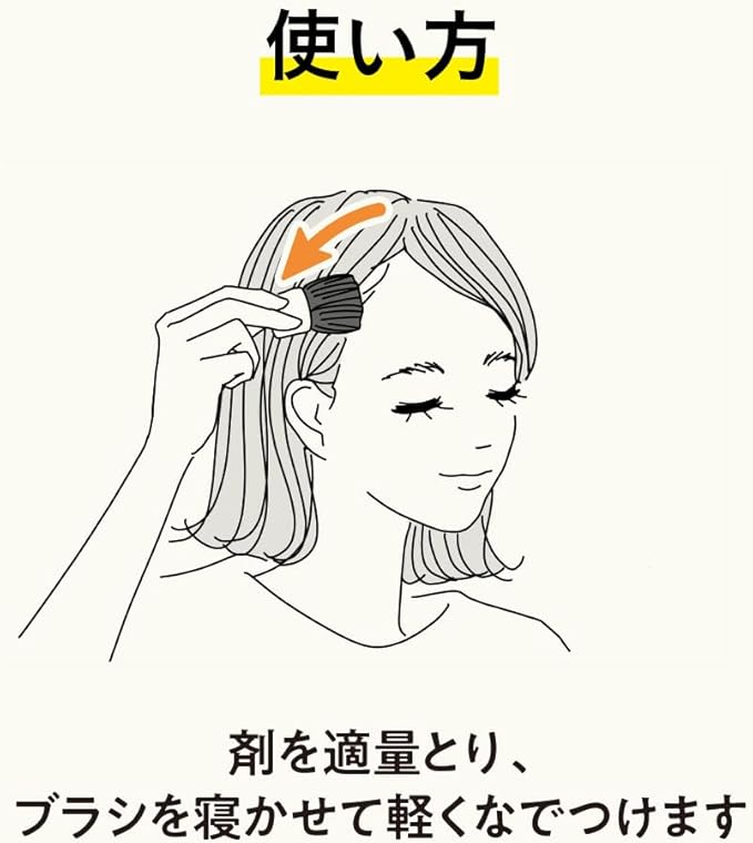 使い方 ①ブラシに剤を適量とります。 ②気になる生え際や分け目の毛流れに沿ってブラシを軽くなでつけ、毛の足りない部分に描き足します。 ●初めてご使用する際は数回ブラシに剤をとって試し描きしてください。 ●落とす時は普段お使いの洗浄料で、よく洗ってください。 ●ブラシをご使用後はティッシュペーパー等でやさしく汚れを拭き取ってください。 ●ブラシの汚れがひどくなりましたら、中性洗剤を薄めたぬるま湯の中で軽く振り洗いをし、よくすすいだ後、水気を取り毛先を整えて十分に陰干ししてください。 ●使用後はフタをきちんとしめてください。 ●白髪染めではありません。