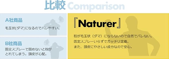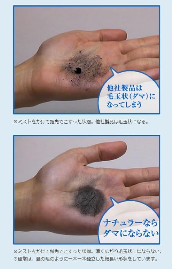 軽く頭皮になじませれば容易には取れないほどガッチリと付着します。 また、粉の表面に凸凹をつけることにより定着力を格段にアップさせています。そのため、固定スプレーやミストによる接着なしでも簡単には取れません。