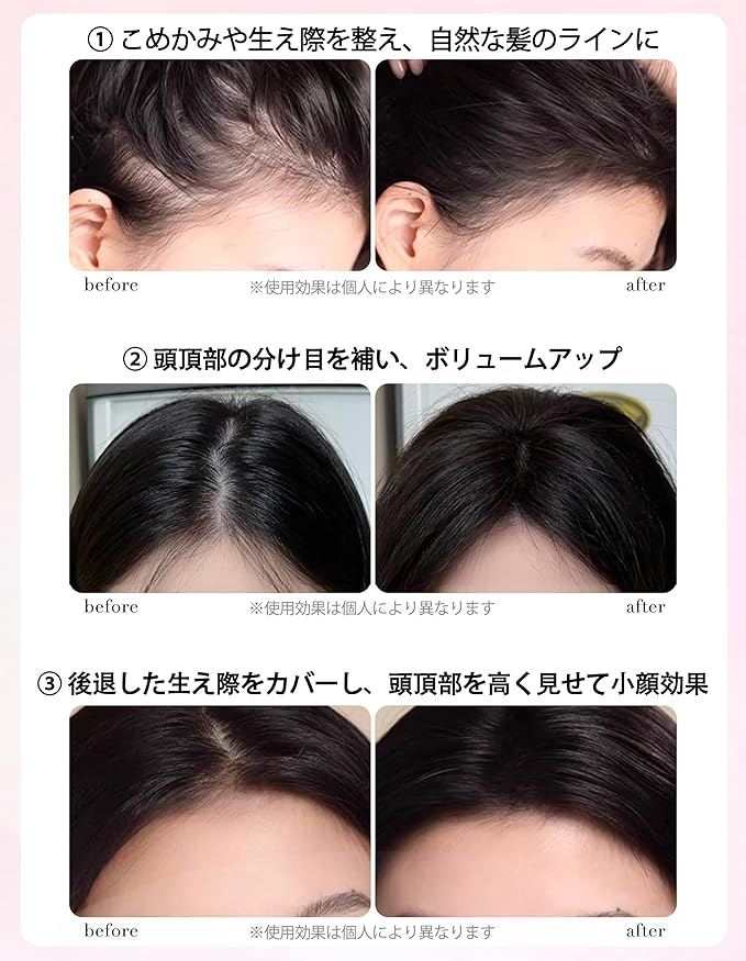 2. 【長時間キープ】 高い耐水性・耐汗性により、夏の暑さやスポーツ時、雨の日でも色落ちや崩れをしっかり防止。軽く触れても取れにくい、高い定着力を実現しています。日中何度も塗り直す必要がなく、朝セットした美しい生え際のラインや地肌カバーを、夜まで長持ちさせます。