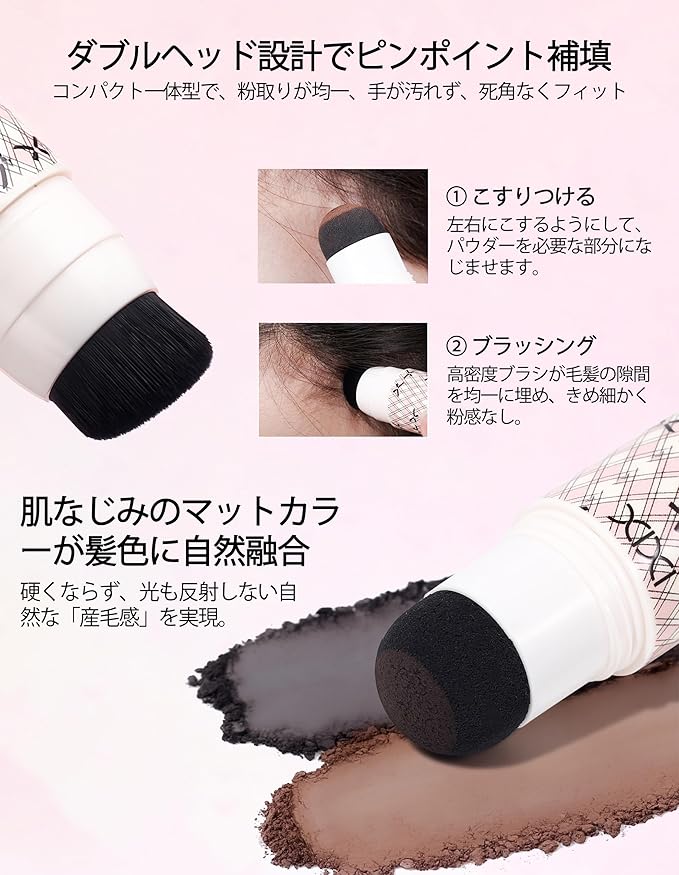 3. 【ダブルヘッド&専用ブラシ付き】 細部まで行き届く専用長毛ブラシと、広範囲をサッとカバーできるスポンジのダブル設計。生え際や分け目など、細かい部分もブラシでなぞるように自然に塗布でき、スポンジ側では素早い全体補正が可能。コンパクトで携帯性も抜群なので、職場や外出先でのちょっとした気になる部分の補修に大活躍します。