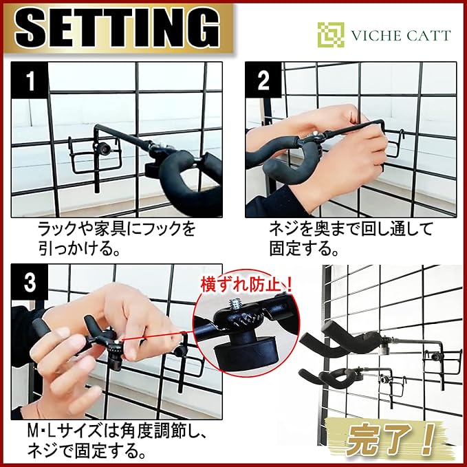 現在お持ちの家具やメタルラックなどに引っかけ、手でネジ調整をするだけで設置が可能。 あとは楽器を引っかけるだけなので使用したい時のとり外しも楽々。 お店のディスプレイ風にセットすれば、使わない時はインテリアとして早変わりするので、魅せて収納の一石二鳥♪ お気に入りのギターを壁に並べるとお部屋の雰囲気がぐっと上がります! もちろんギターを支える程の強度を備えているので、バッグや帽子などを引っかけるフックとして使用することも可能です。