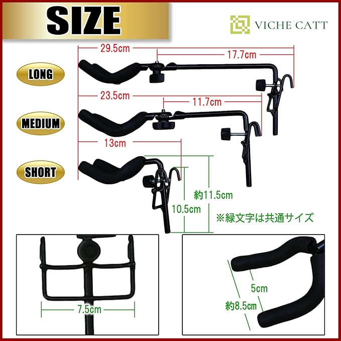 【サイズ】 ショート:長さ13㎝ ミディアム:長さ23.5㎝ ロング:長さ29.5㎝ ギター設置用フック部分(共通):(内側)5cm(外側)8.5cm ラック引っかけ部分:10.5cm 7.5cm 同サイズ二個セットでお届け