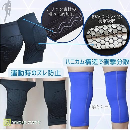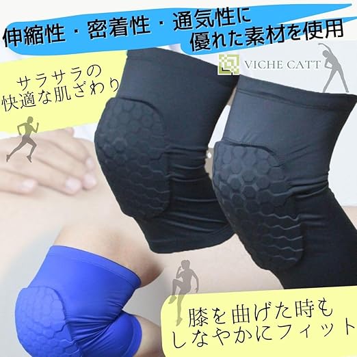 膝部分のパッドは、ミツバチの巣より名前が付いたハニカム構造で六角形のスポンジがたくさん並んでいます。 そのため、曲げた時にもしなやかにフィット。衝撃エネルギーを吸収し、膝へ負担を軽減してくれます。 良く伸びるスパンデックスを配合しているので、通気性を保ち、運動中に生じる汗をそのまま放出させるので、べたつく事もありません。 吸湿性と速乾性素材で、汗を素早く吸収速乾し、快適な履き心地を維持してくれます。