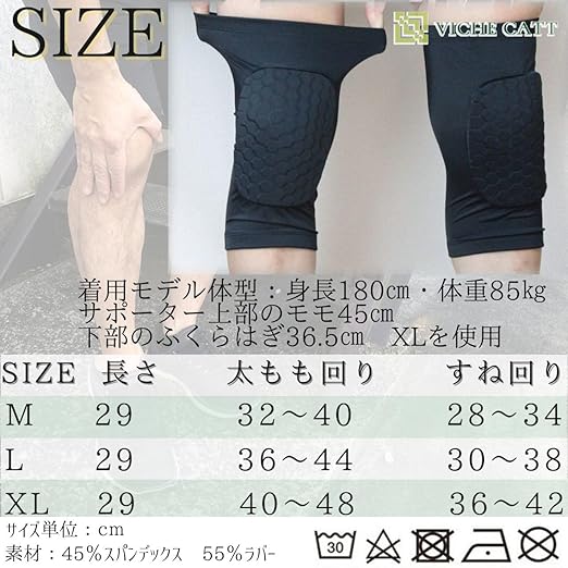 サイズ: Mサイズ:長さ29cm 太もも回り32~40cm すね回り28~34cm Lサイズ:長さ29cm 太もも回り36~44cm すね回り30~38cm XLサイズ:長さ29cm 太もも回り40~48cm すね回り36~42cm 素材:45%スパンデックス、 55%ラバー カラー:ブラック・ブルー M 、L 、XL