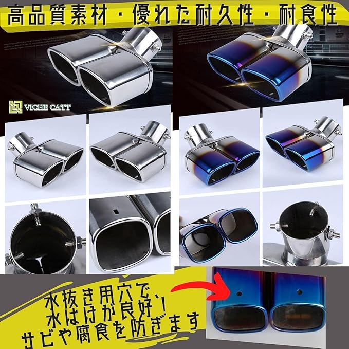 錆びにくいステンレスで作られているので、サビや腐食に強く、耐久性・耐食性に優れています。水抜き用穴があり、水はけが良好!サビからこのデュアルマフラーカッターをしっかり守ります。 取り付け方法は、ドリルや溶接などをせずに、既存のマフラーに差し込み、ボルトを締め付ける簡単装着。 そのうえ、取付ボルトは3点式となっており、がっちりホールドで安心です。この際しっかりとボルトの取り付けを行って下さい。(脱落防止の為) バンパーへの干渉が無ければ、とても簡単に装着できるのもオススメポイントです。