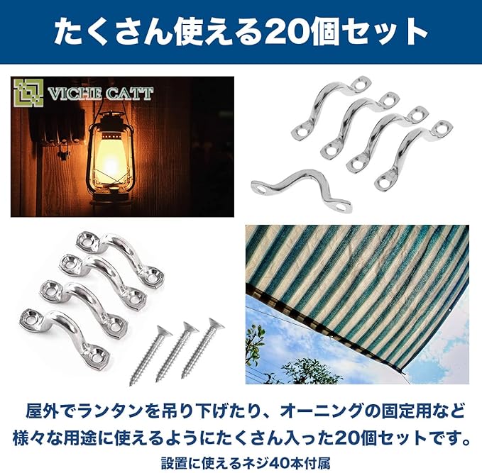 たくさん使える20個セット 屋外でランタンを吊り下げたり、オーニングの固定用など様々な用途に使えるようにたくさん入った20個セットです。自宅や庭、アウトドアで使用する道具など設置場所を問いません。設置に使えるネジ40本付属
