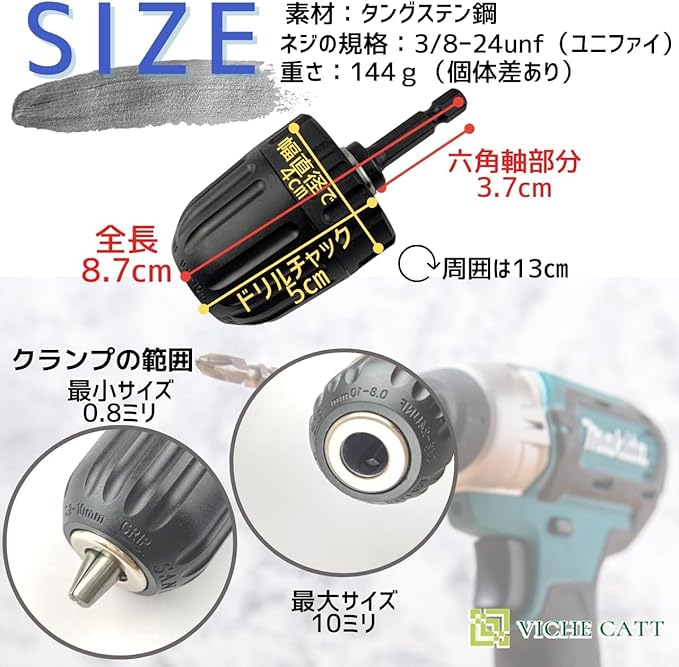 本体: 全体長さ8,7cm(ドリルチャック部分5cm ・ 六角軸3,7cm) 幅 直径は4cm 素材:タングステン鋼 六角軸の直径:約6mm 0,8mm~10mm クランプの範囲 3/8ー24unf(ユニファイ) ネジの規格 重さ:144g(個体差あり)