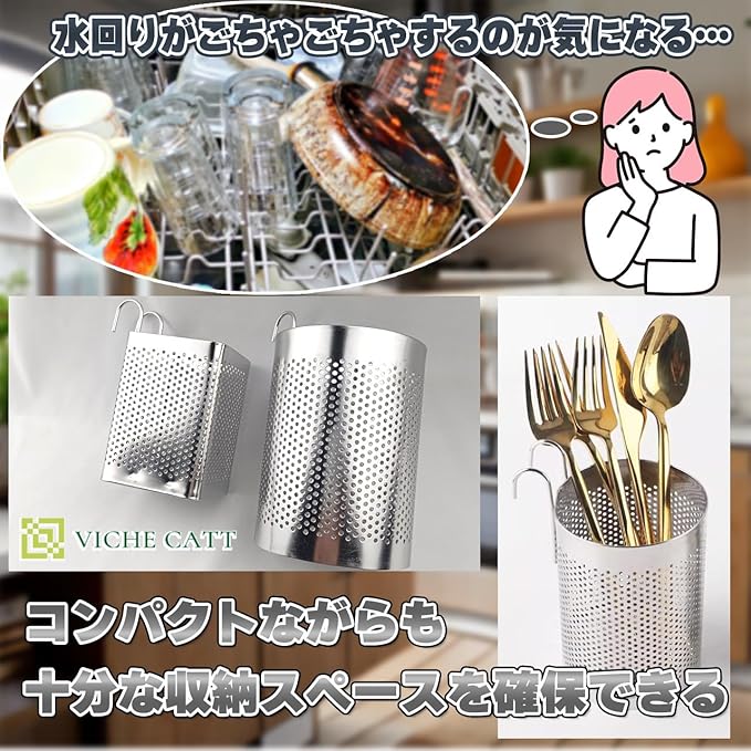 お手入れも簡単で、拭くだけで美しさを保つことができます。 コンパクトながらも十分な収納スペースを確保できるので、キッチンの片付けや整理整頓に役立ちます。 引っかけるフックがあるので、キッチンや水回りの限られたスペースを最大限に活用できます! 水回りだけでなく、ペン立てなどとしてのコンパクト収納としてもおすすめです。
