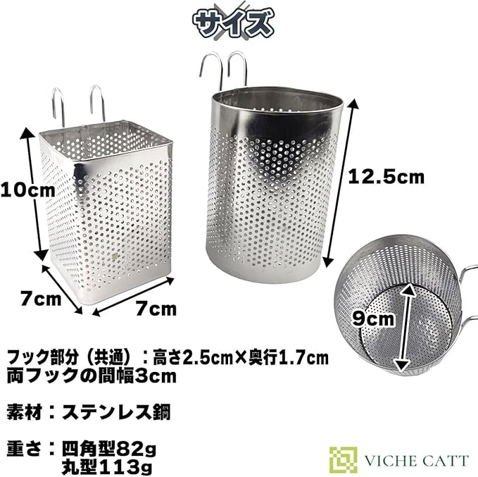 サイズ 四角型:高さ10cm 横7cm 7cm 丸型:高さ12.5cm 直径9cm 9cm フック部分(共通):高さ2.5cm 奥行1.7cm 両フックの間幅3cm 素材:ステンレス鋼 重さ:四角型82g 丸型113g