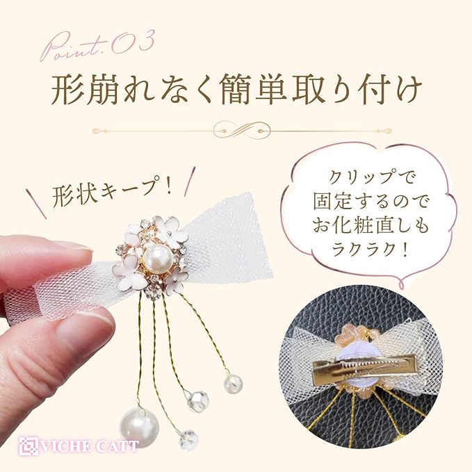 リボンは張りのある素材メッシュタイプなので、形崩れの心配もありません。クリップで取り付けできるので、お化粧直しも簡単。短いヘアスタイルでも可愛くスタイリングできます。
