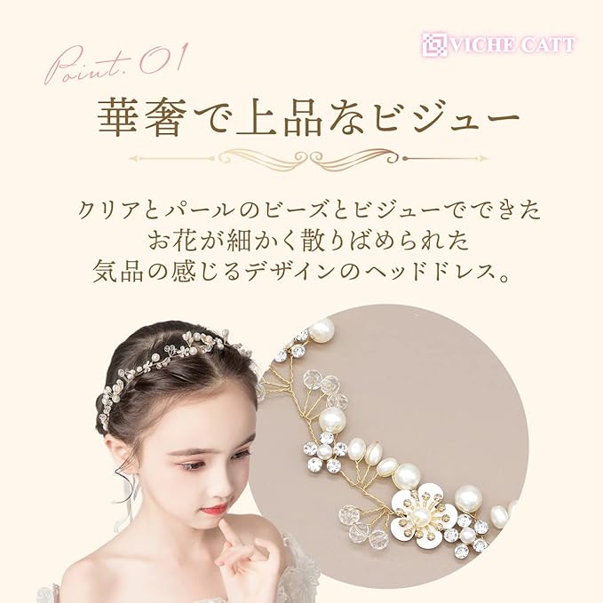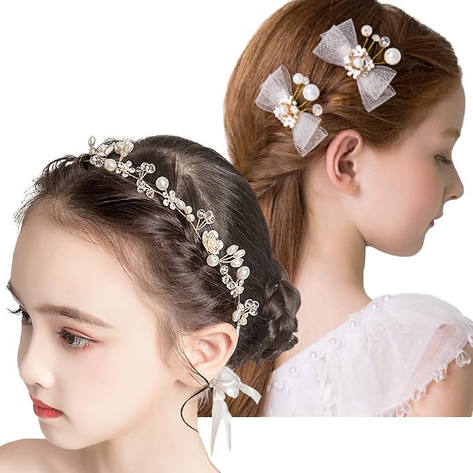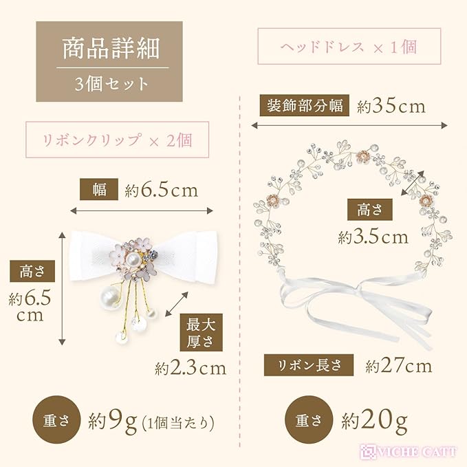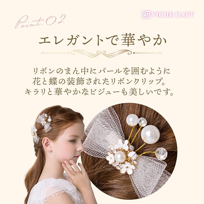 VICHE CATT ヘッドドレス ヘアアクセサリー 2個 3点セット 髪飾り リボン カチューシャ バレッタ キッズ 発表会 結婚式 (3点セット)