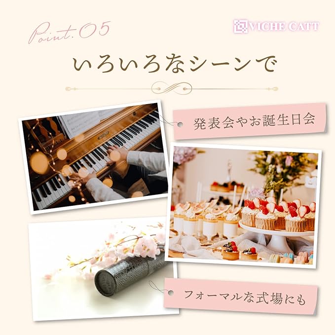 結婚式、パーティー、ピアノの発表会や、七五三、コンサート、入学式、卒業式など、フォーマルな行事からカジュアルなシーンまで、幅広い場面でご使用いただけます。